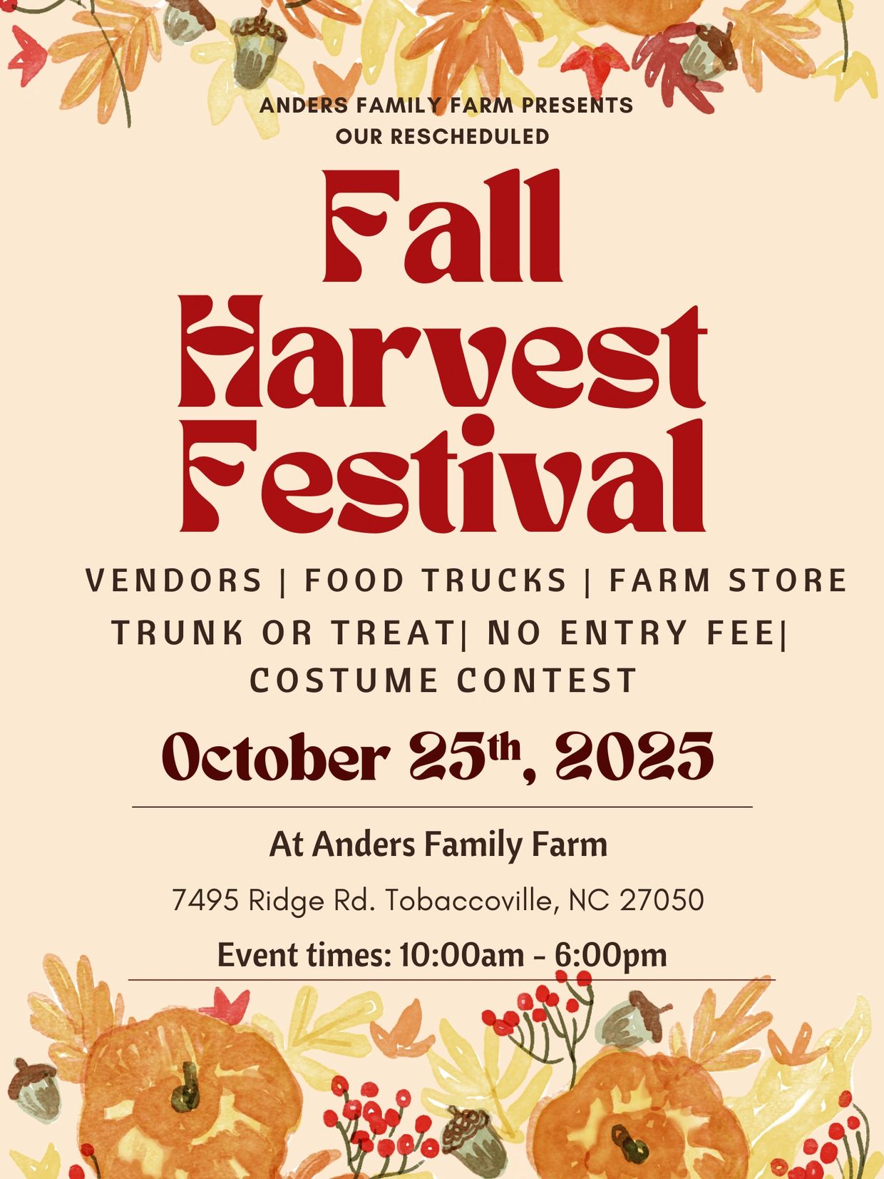 Our fall harvest festival will be October 25th 2025 from 10am-6pm